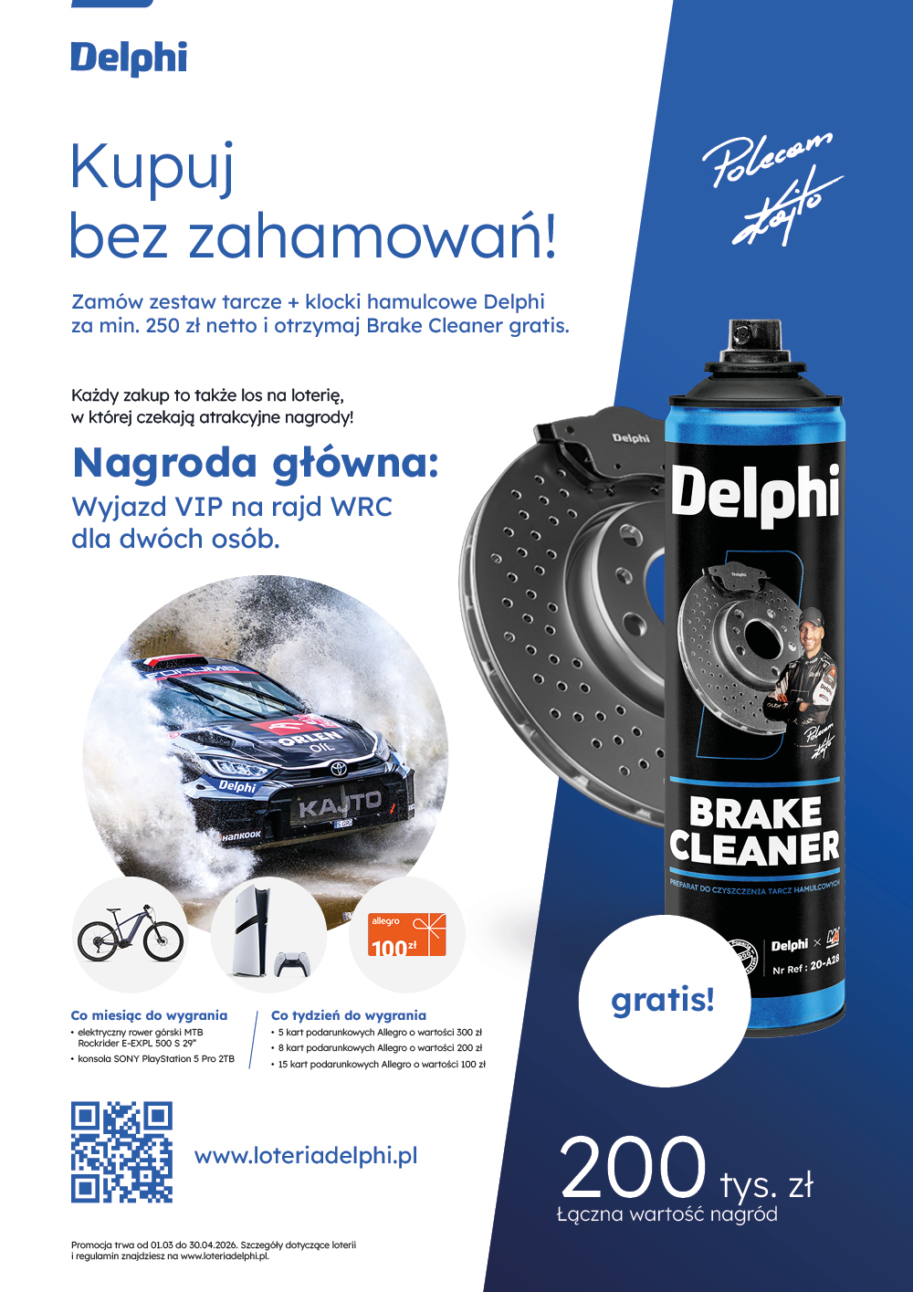 W ramach promocji Klienci, którzy kupią zestaw tarcz i klocków hamulcowych Delphi o wartości minimum 250 PLN/netto, otrzymają zmywacz do hamulców GRATIS!*